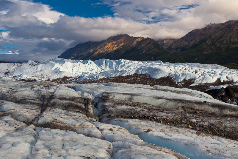 Очень зрелищный ледник в 170 км от Анкориджа и в шаговой доступности от хайвея. Можно сравнительно легко «выйти на лед» расставшись с 25ю долларами у входа (там ловкие ребята сидят у шлагбаума и собирают за вход, на «ремонт провала»). Имея общую протяженность около 43 километров и ширину в среднем около 6 км ледник «ползет» вниз со скорость около фута (30м) в день однако за счет таяния положение его нижней оконечности остается неизменным уже несколько лет.
